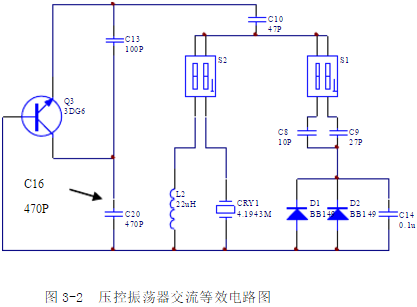 2.壓控振蕩器(VCO):將1S的1或2撥上,2S的1撥下、2撥上(不接CRY1石英晶體),則變容二極管1D、2D并聯在電感2L兩端。當調節(jié)電位器W1時,1D、2D兩端的反向偏壓隨之改變,從而改變了1D和2D的結電容Cj,也就改變了振蕩電路的等效電容,使振蕩頻率發(fā)生變化。其交流等效電路如圖3-2所示。